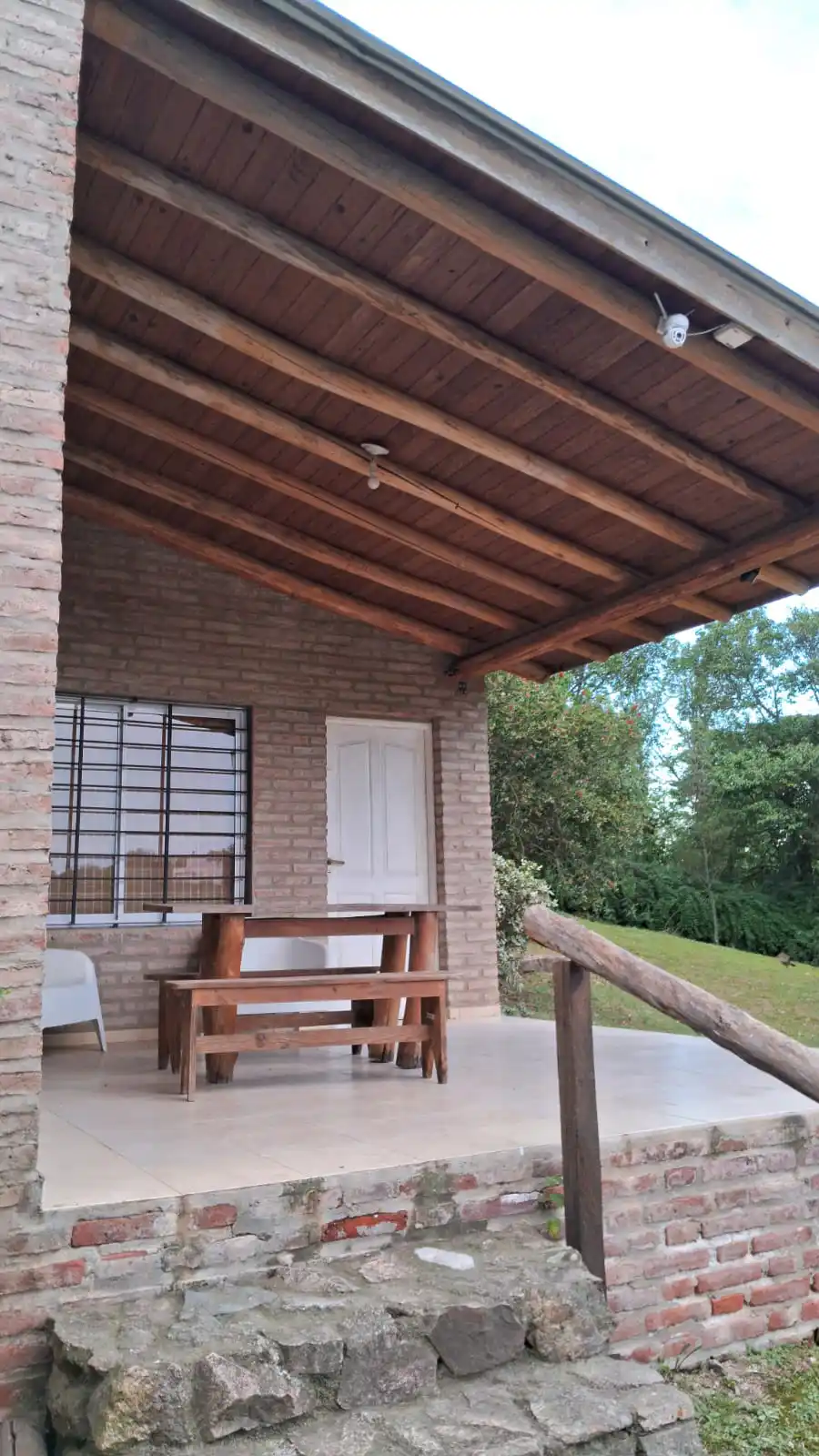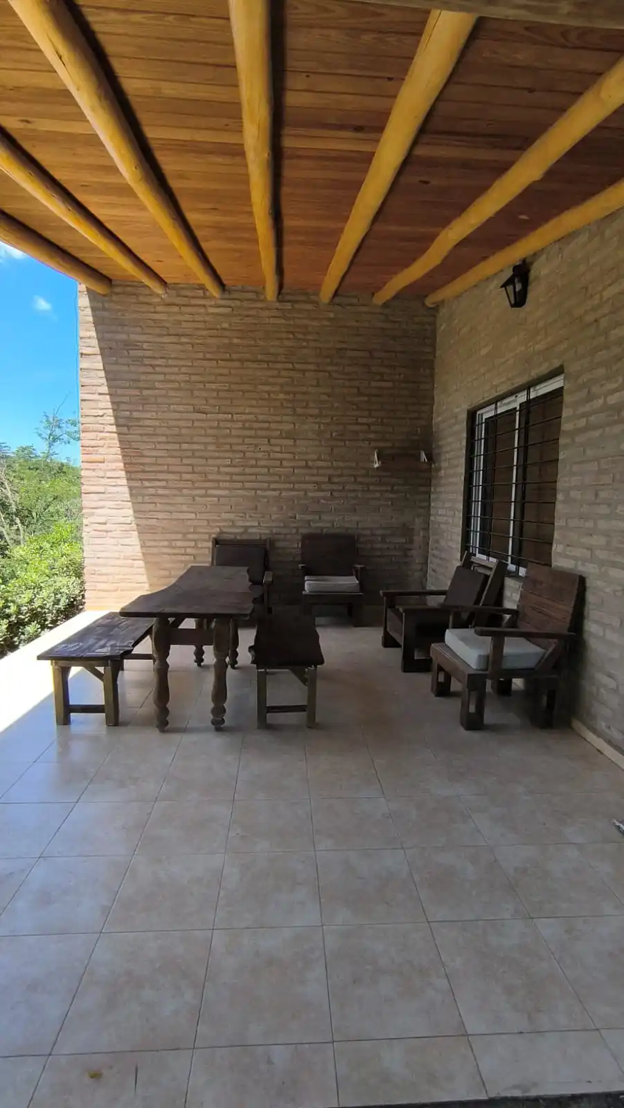 Amplia galería con mesa y bancos de madera.