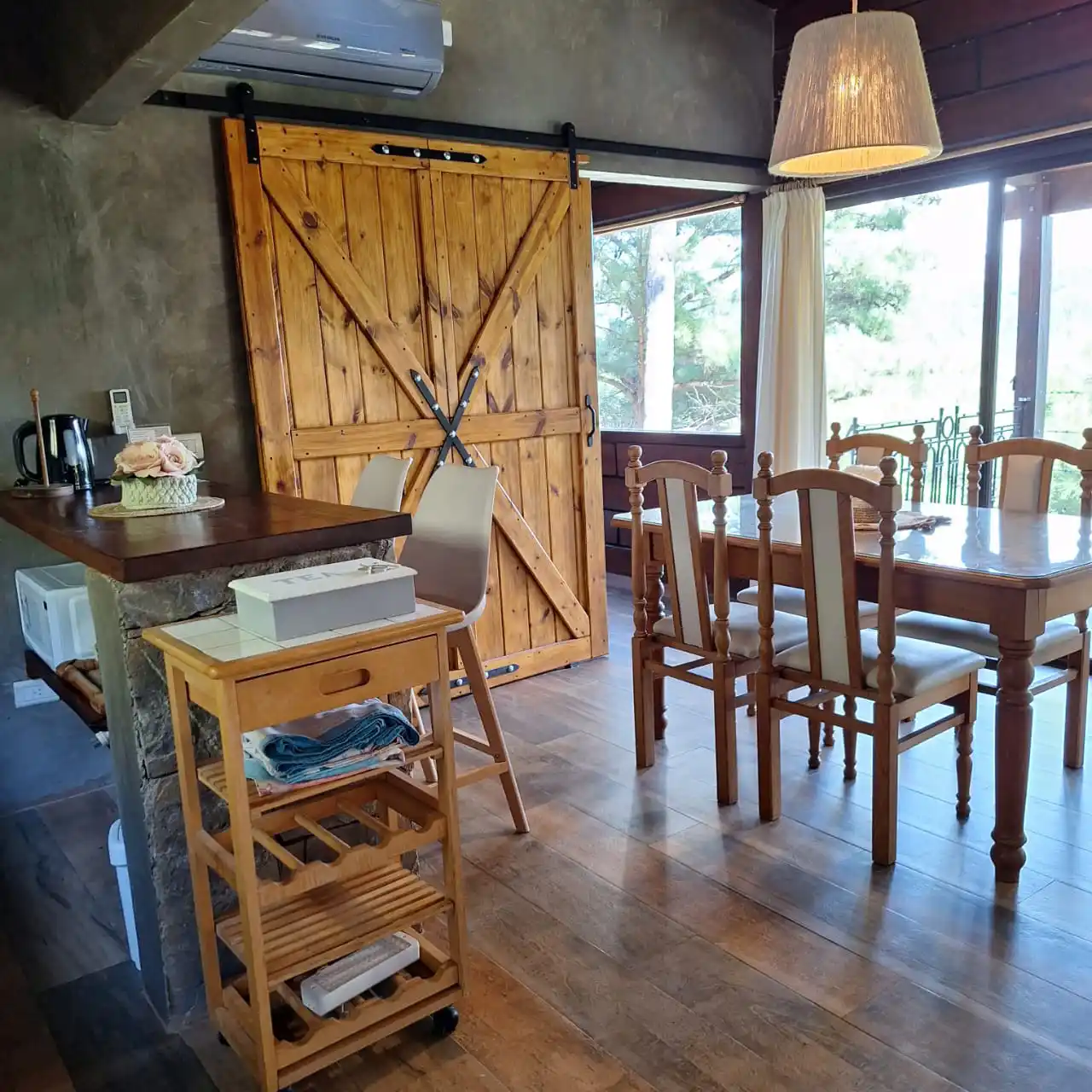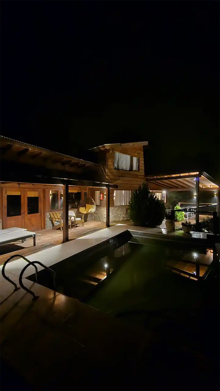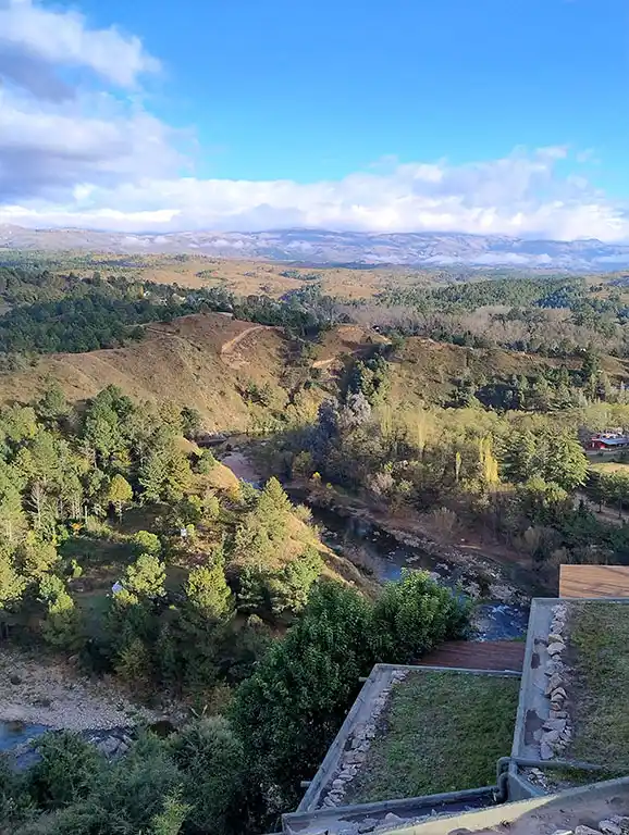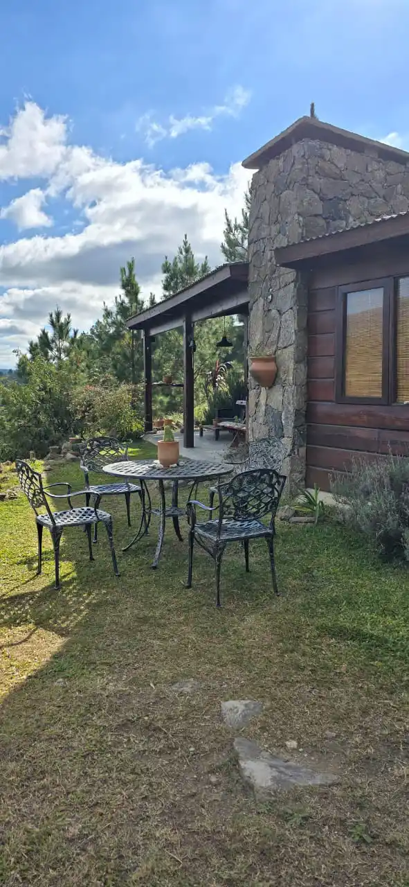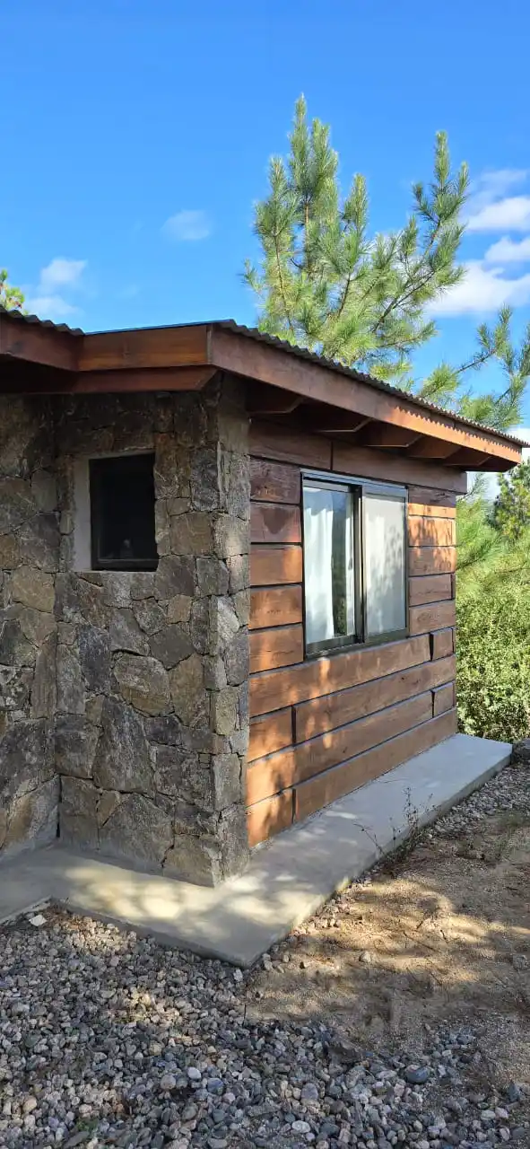 Cada cabaña es particular aunque todas siguen el mismo estilo de construcción que se pierde en los colores de la naturaleza, rodeados de Pinos, Montañas y Río.